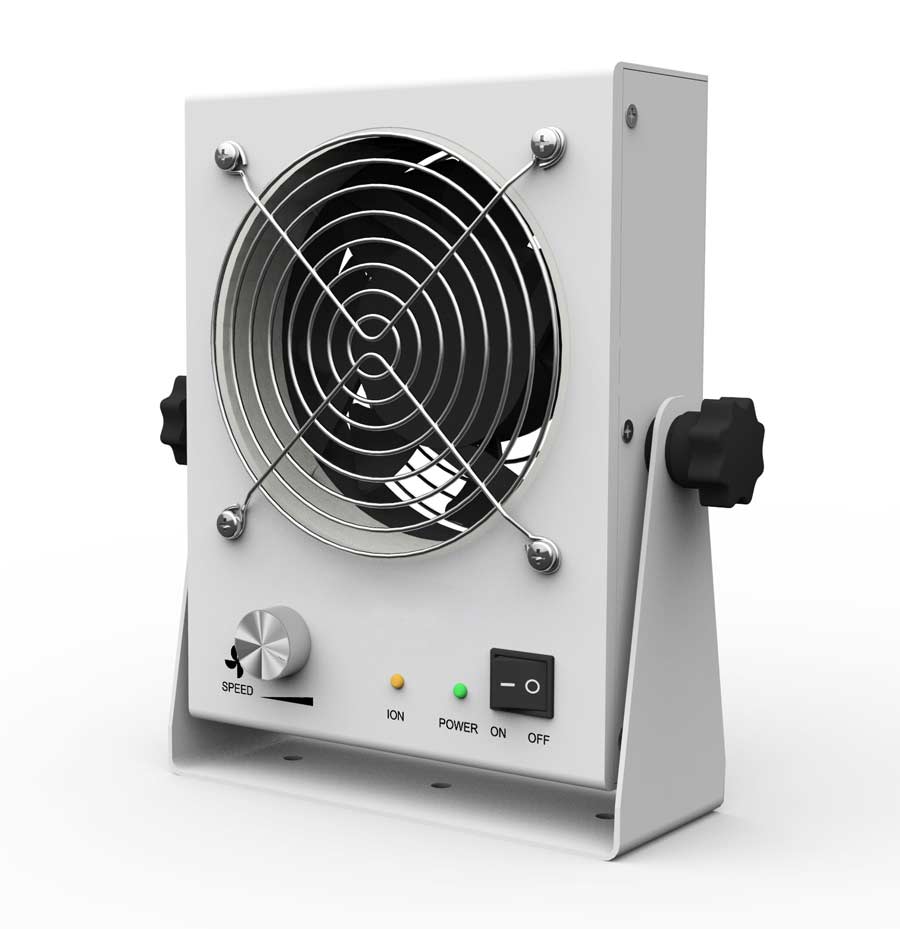 台式離子風機采用正、負同步發射電極,通過直流高壓產(chan) 生電暈放電,將空氣分子電離,產(chan) 生大量正、負極性的空氣離子,並由風扇將其吹向被消物體(ti) 表麵進行靜電消除。可廣泛應用於(yu) 電子、光電等行業(ye) 。