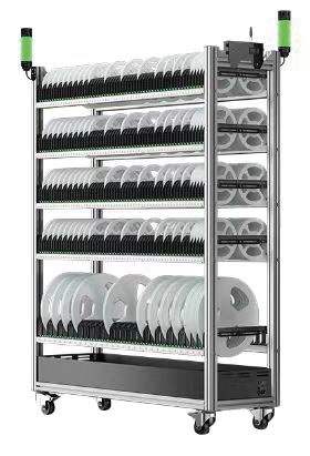 A型智能料架為(wei) 標準7寸料盤存儲(chu) 料架,雙麵存放,1400個(ge) 儲(chu) 位,單色,多色可選,最大可支持7色