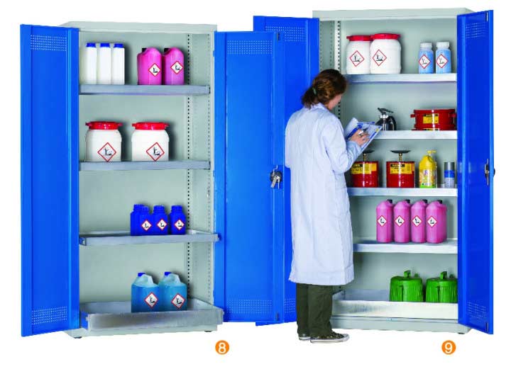 用於(yu) 汙染液體(ti) 的存儲(chu) ,可調式隔板,上下25mm可調 可移動式底部貯存盤高100mm,無縫焊接,更好防泄漏 門板的頂部及底部帶通風孔,自然通風,門開啟角度12。 隔板/貯存盤式層板每層最大承重60KG (可抽出式除外) 櫃體(ti) 最大承重承重:300KG