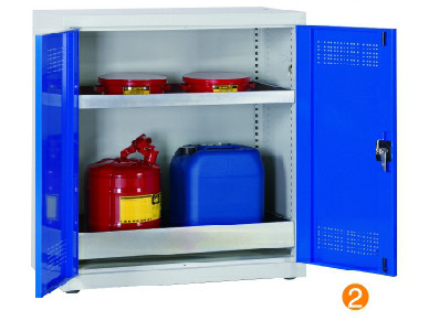 用於(yu) 汙染液體(ti) 的存儲(chu) ,可調式隔板,上下25mm可調 可移動式底部貯存盤高100mm,無縫焊接,更好防泄漏 門板的頂部及底部帶通風孔,自然通風,門開啟角度12。 隔板/貯存盤式層板每層最大承重60KG (可抽出式除外) 櫃體(ti) 最大承重承重:300KG